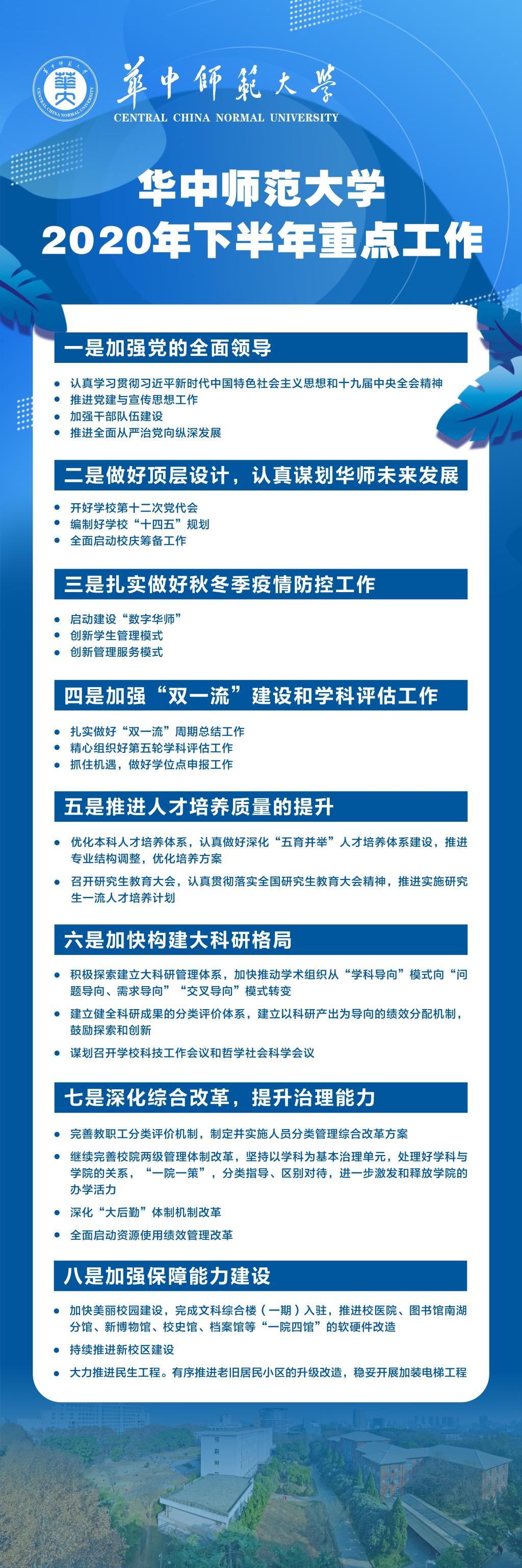 郝芳华强调,下半年工作任务完成效果直接关系到“十三五”规划的收官和“十四五”规划的开篇布局,全校上下要紧紧围绕2020年工作要点,坚持一张蓝图绘到底。结合今年工作要点完成情况和暑期务虚会精神,郝芳华从加强党的全面领导、做好顶层设计认真谋划华师未来发展、扎实做好秋冬季疫情防控工作、加强“双一流”建设和学科评估工作、推进人才培养质量的提升、加快构建大科研格局、深化综合改革提升治理能力、加强保障能力建设八个方面,对我校下半年重点工作进行了部署。