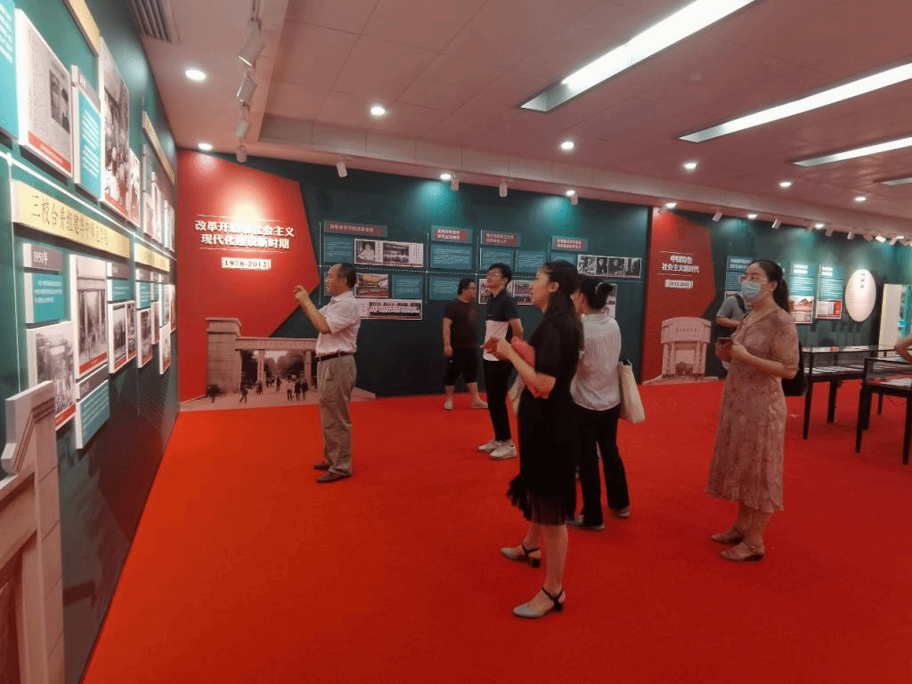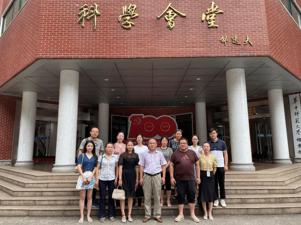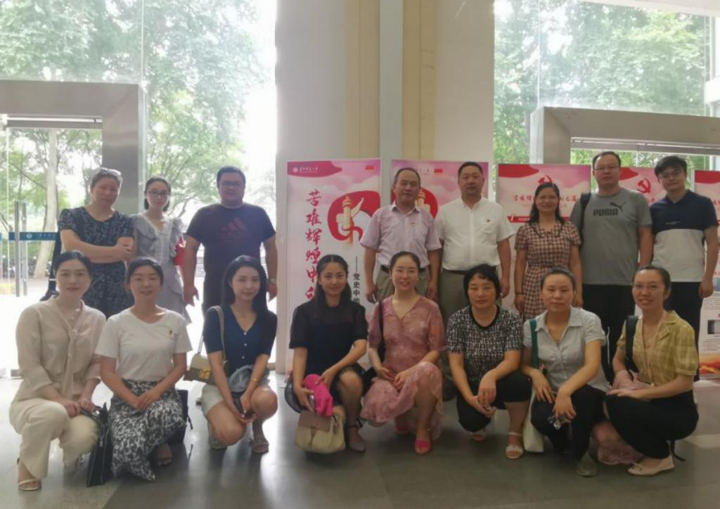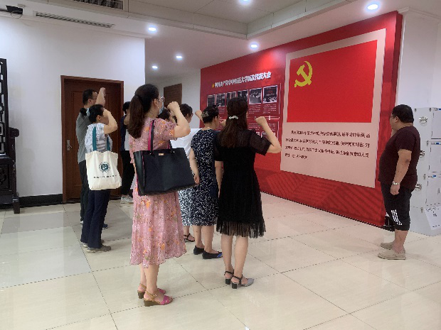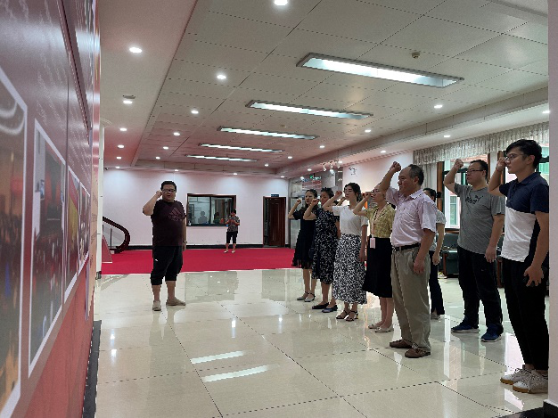 早上9点,聂书记一行前往科学会堂一楼参观“明灯百年照 丹桂双甲香——华中师范大学红色印记展”,学习党史中的校史故事。丰富的图文资料讲述着华师一百多年历史上的红色印记、红色时间、红色资源,呈现了新民主主义革命时期、社会主义革命和建设时期、改革开放和社会主义现代化建设新时期、中国特色社会主义新时代四个时期华师人在党的领导下投身教育醒国、教育救国、教育建国、教育富国、教育强国的百年征程,带给老师们很大的震撼和触动。最后,支部党员同志在支部书记周斌带领下,现场重温入党誓词并合影留念。